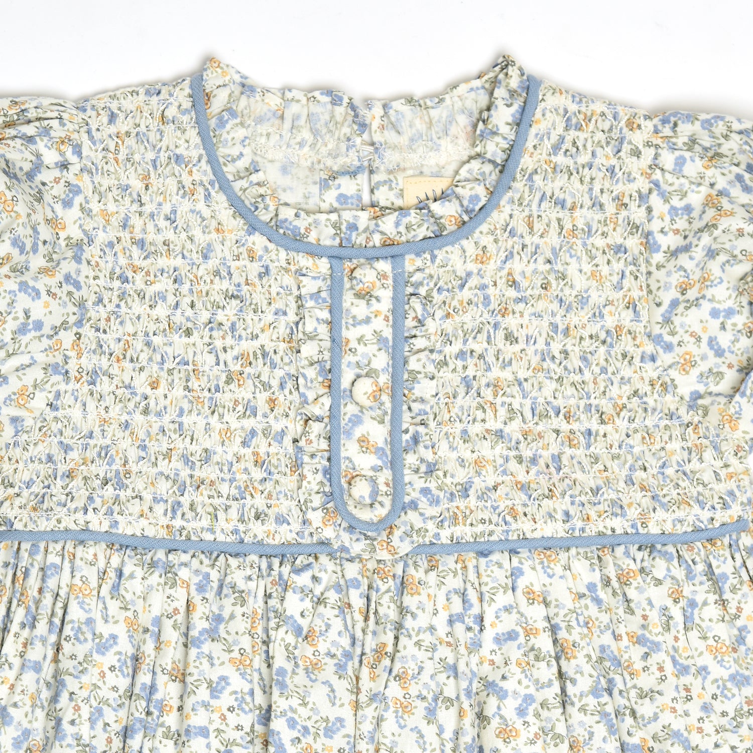 A charming vintage-inspired baby dress featuring delicate blue and yellow floral print, smocked bodice, puff sleeves, and soft trim details. Perfect for any occasion or everyday wear with timeless style.